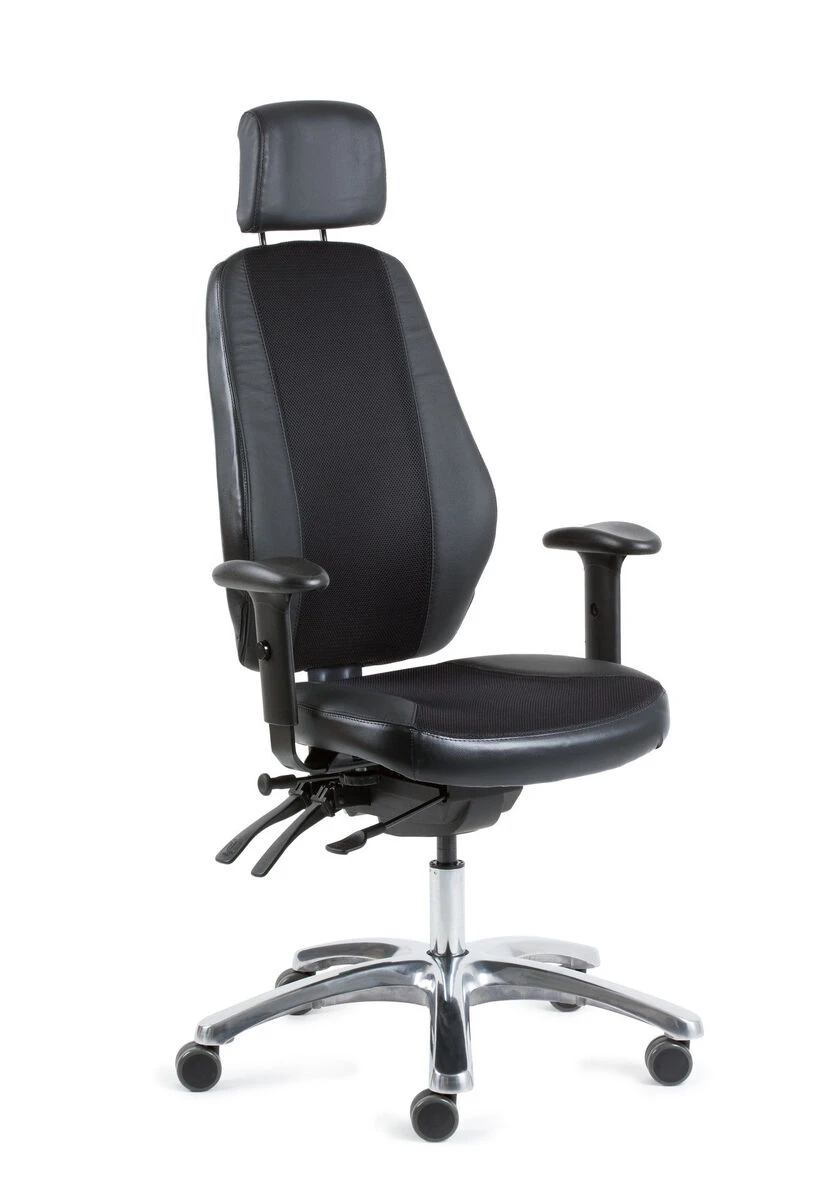 Optimum lux työtuoli monipuolisilla säätöominaisuuksilla mahdollistaa parhaan mahdollisen istuinmukavuuden. Niskatuki ja korkea selkänoja tukevat ristiselän lisäksi yläselkää. Korkeus- ja sivuttaissuunnassa säädettävät käsinojat vakiona. Nahkaiset sivut verhoiluosissa lisäävät arvokkuutta.