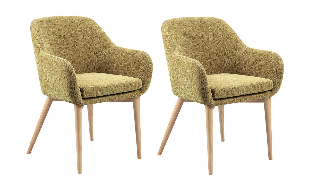 Kangasverhoiltu ruokapöydän tuoli massiivisaarni jaloilla.