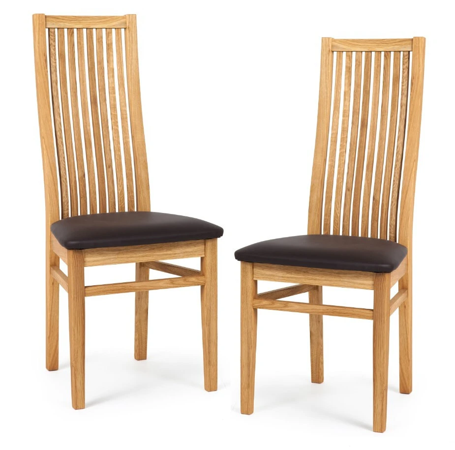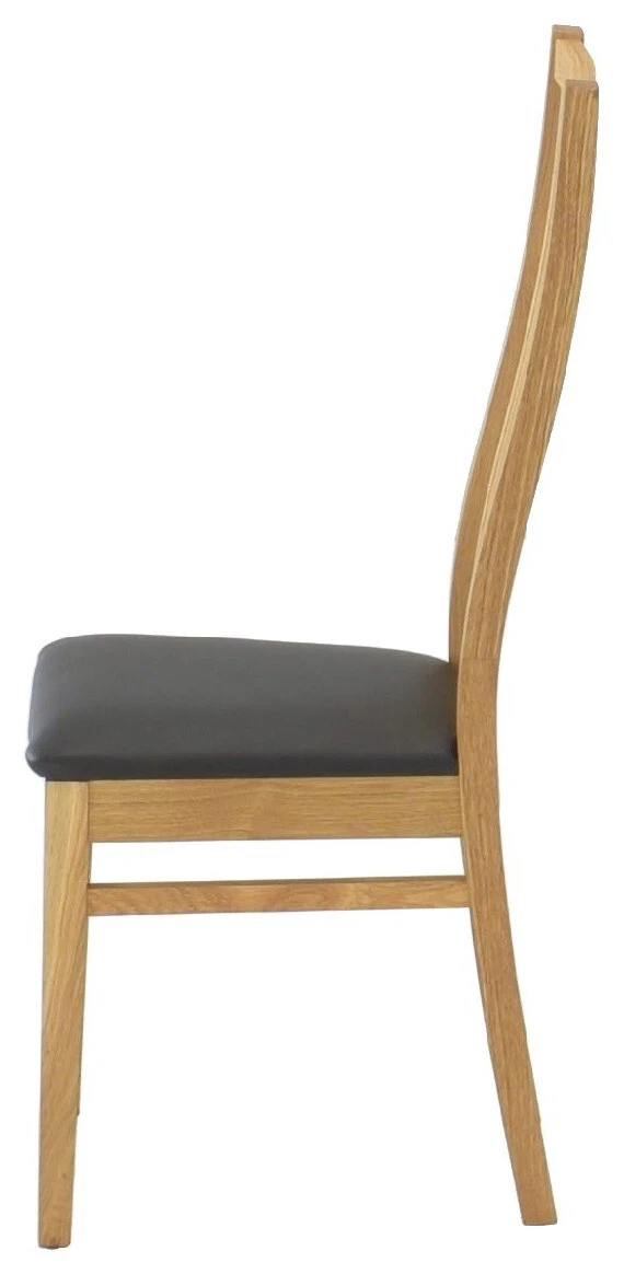 Modernisti ajaton Sandra ruokatuoli on valmistettu massiivitammesta. Selkänoja kaareutuu kauniisti ja antaa hyvän tuen koko selälle. Tuolin pinta on viimeistelty puolikiiltävällä lakalla. Istuimessa on pehmustettu, keinonahkaverhoiltu istuin.